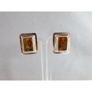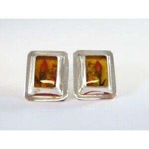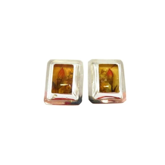 This vintage earring set features genuine pressed flowers encased in amber-toned resin, framed in rectangular sterling silver settings. Made in the Taxco, Mexico tradition, these earrings are signed by Talleres Lagunas with the hallmark "LTT" and "0.925". Each earring has a post back with butterfly closure. A distinctive and rare example of mid-20th century floral resin jewelry by Talleres Lagunas.