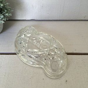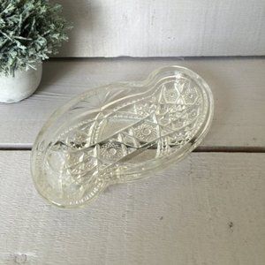 This gorgeous glass nut dish is just lovely. The design is a series of triangles interspersed with stars and a flower like pattern. The criss cross pattern creates a lovely reflection when the light shines on it.