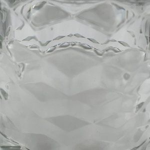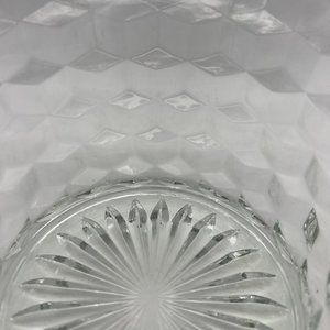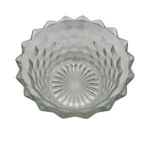 Vintage pressed glass candy dish. Standing at 3.5" tall and measuring 5.5" across, it showcases a cube pattern and a starburst bottom. With its timeless design, this candy dish adds both elegance and practicality to your decor.