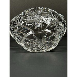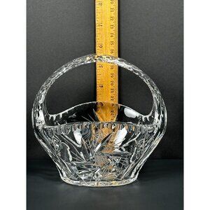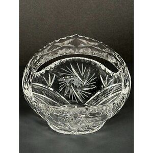 This vintage pressed glass crystal basket serves as an elegant candy dish or decorative piece. Ideal for sophisticated home decor and timeless display.