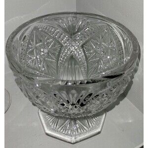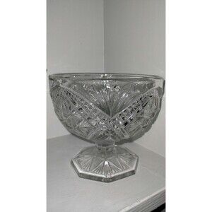 Step back in time with this dazzling vintage pressed glass compote bowl. Resting proudly on its octagonal pedestal base, the bowl shimmers with intricate starbursts, diamond cuts, and textured cross-hatch designs that catch the light beautifully. Perfect for serving fruit, candy, or trifle at the holiday table, it also makes a striking centerpiece on its own.