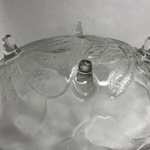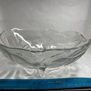 Add a touch of elegance to your dining table with this vintage pressed glass centerpiece bowl. The beautiful poppy flower pattern and clear glass material make it a perfect addition to any themed table setting. This large, oblong bowl is ideal for serving fruit or other dishes and its footed base ensures a sturdy hold. The production technique of pressed glass adds to its durability and gives it a unique texture. This centerpiece bowl is a must-have for any collector of vintage glassware.