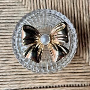 Add a touch of elegance to your vanity or dresser with this charming vintage-style glass trinket jar. The clear pressed glass base features ribbed detailing, while the lid is topped with a glamorous gold-tone bow and faux pearl center. Ideal for holding rings, small jewelry, or cotton rounds—both functional and decorative!