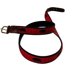 This Preston men's dress belt is size 48 and features a solid red color with a bear theme. Made in the USA, it is crafted from leather with brass hardware and includes embroidered accents. The belt has a buckle and is designed in a vintage style. It is pre-owned but in excellent condition.