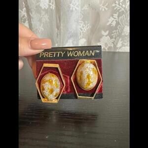 Make a bold statement with these vintage "Pretty Woman" clip-on earrings, featuring a unique hexagon gold-tone frame and marbled stone center. The earthy tones and geometric shape create a striking retro look that’s perfect for adding a touch of vintage flair to any outfit. Ideal for collectors or anyone who loves standout, one-of-a-kind jewelry pieces!
