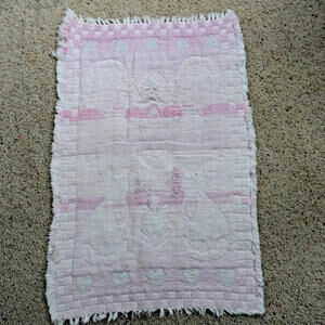 Vintage Primitive Cottage Cat Rug Handmade FLAWED Cats Decor Grandma VTG Hearts 33x21.5" small fringe handmade retro gma kittens white pink old cottage core checkerboard