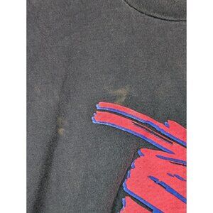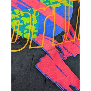 Vintage Prince Tennis Shirt Size XL Black Wrap Graphic 80s 90s Single Stitch USA Neon Retro Colorful. There are some small stains on the front, see photo 2. There are also two cuts/slashes on the front of the shirt (photo 3). Measures approximately 21" armpit to armpit and 29" in length down the middle of the back