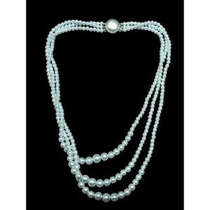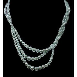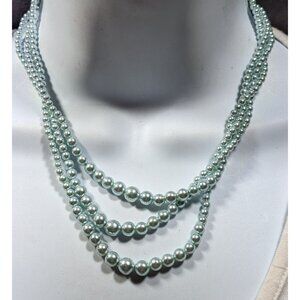 Elegant vintage-inspired necklace featuring light blue faux pearls in a layered design. Perfect for adding a touch of sophistication to any outfit. Ideal for special occasions or everyday wear.