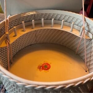 Made of high-quality wicker, it features a beautiful cream tan color and has spool holders for easy organization. The basket stands at 6 inches tall and is 10.75 inches wide. Composite Masonite lid. Dating back to the 1940s