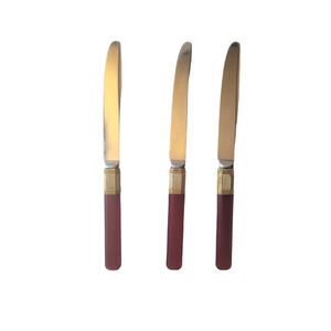 Step back in time to an era of mid-century elegance with this set of "Vintage Prisma Laslo For Mikasa Knives." Crafted with meticulous attention to detail, these knives are a delightful reminder of a period when even kitchen utensils were a work of art. Made in Japan, they feature Opaque Handles adorned with Gold Tone Details, making them a true collector's gem.