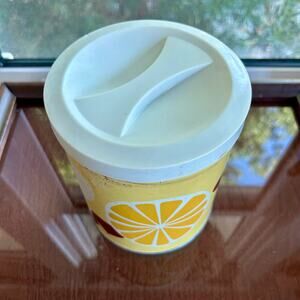 Charming vintage Procter & Gamble metal canister featuring a bright yellow background with bold retro fruit graphics, including orange slices, red cherries, and apples. The canister has its original off-white plastic twist-top lid, designed to rotate open and closed.
