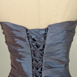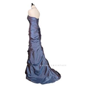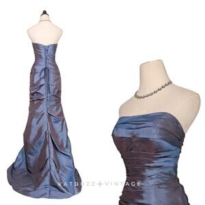 Y2K strapless prom dress maxi corset gown from Bill Levkoff, size 4. Purplish blue with duo-chrome shimmer, strapless, lace up back, pleating, a-line/mermaid skirt with train. Ideal for fairy princess, glam, classic, elegant, and movie star red carpet vibes.