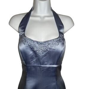 This stunning satin halter gown is giving late 90s–early Y2K prom / formal energy in the best way.