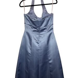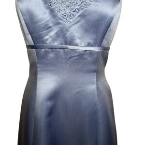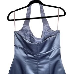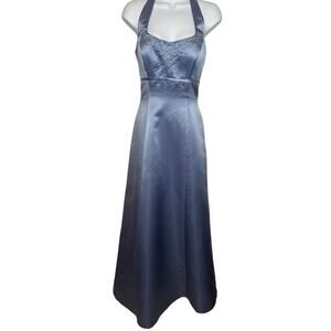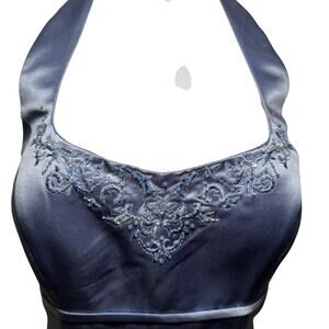 Silky blue satin fabric with a soft sheen, flattering empire waist, and delicate beaded embroidery at the bust. The halter neckline and long, flowing silhouette create that iconic vintage formal look you’d see in old prom photos, early red carpets, or a 2000s teen movie.