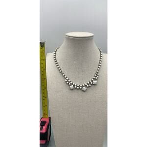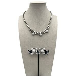 The Vintage Prong Set Milk Glass & Silver Tone Necklace and Screw Back Earring Set is a classic and beautiful jewelry set featuring a white milk glass material with a silver tone setting. The set includes a necklace and earrings, both with a vintage design that exudes elegance and timeless charm. Perfect for those who appreciate unique and vintage pieces that add a touch of nostalgia to their outfit, this set is a stunning addition to any jewelry collection.