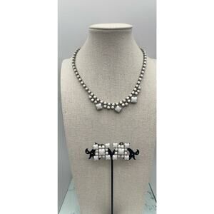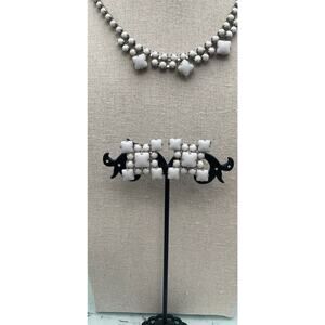 Vintage Prong Set Milk Glass & Silver Tone Necklace And Screw Back Earring Set