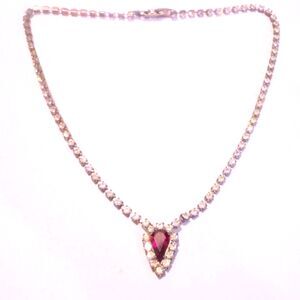 This stunning Vintage Prong Set Rhinestone Demi Parure features a dazzling necklace and matching pierced earrings, both crafted in a classic silver-tone finish. The necklace, measuring 16 inches in length, showcases elegant pear-shaped ruby red rhinestones, prong-set alongside sparkling clear rhinestones, creating a radiant, timeless design. It secures with a sturdy hinged clasp for ease of wear. The matching earrings, designed for pierced ears, measure 7/8" in length by 1/2" in width and are similarly adorned with striking ruby red and clear rhinestones, adding a touch of vintage glamour to any ensemble.