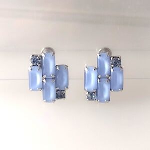 vintage, baby blue, satin, light blue, 1930's, 1940's, 1950's, mid century, screw back, clip-on, earrings, prong set, rhinestone, dazzling, chic, high quality, fashionable, unsigned, silver tone, beautiful