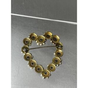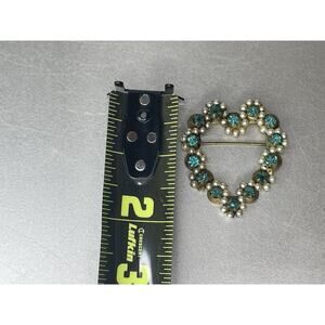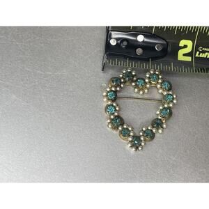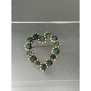 Vintage Pronged Green Blue Heart Rhinestone Pearl Goldtone Brooch Pin