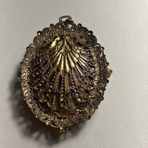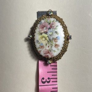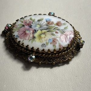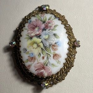 Vintage, Prong-set Porcelain Pendant AB Rhinestone Accents gold tone Ornate design made in Germany.