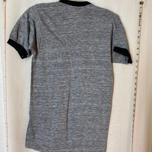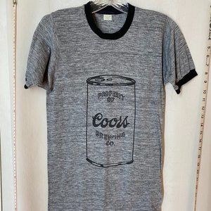 Vintage Property of Coors Brewing Co T-shirt. Made in the USA. Small. Poly blend (the gray is multi-colored). Light weight and semi sheer. Fab graphic with banded collar and sleeves. Pit to pit - 15 at rest (some give, not a lot), back collar to hem - 26. That's as old school as you get.