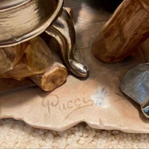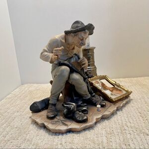 This bisque Figurine depicts a poor tailor/shoemaker using a piece of a painting to patch a shoe or a piece of clothing. This figurine features wonderful detail especially in his hands and face ~ even the thread he is sewing with. The back has the Pucci signature and is numbered 2405. It is 8 1/2 inches high, 7 inches deep and 9 inches wide. The origin of this piece is Naples, Italy. This is a rare find and in excellent condition with no flaws ~ I could find no damage or repairs of any kind. The perfect gift for that person “who has everything” or someone that appreciates Italian art. (I have only been able to find a couple online and they both had damage). This will be double boxed when shipped.