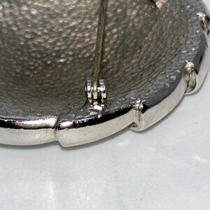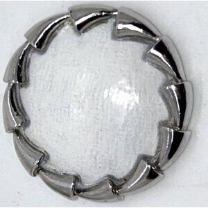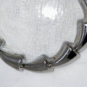 This Puccini brooch features a silver-tone scalloped edge encircling a textured white center. Its timeless design exudes vintage charm.