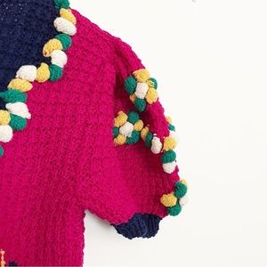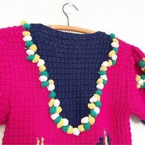 Vintage Puff Sleeve Pom Pom Bauble Knit Sweater Tulip Floral Pattern Size Small