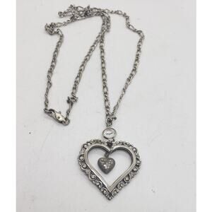 Vintage Heart Locket Necklace Silver Tone Ornate Openwork Pendant in a heart shape with filigree border - inside hangs an etched puffy heart. Above the heart is a swarovski style bezel set crystal.
