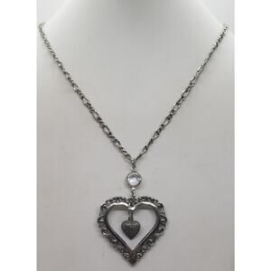 Features a detailed openwork large heart-shaped pendant with intricate scrolling edges and a small etched heart charm dangle in the center. Above the pendant is a round faceted clear glass rhinestone accent.