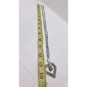 Features a detailed openwork large heart-shaped pendant with intricate scrolling edges and a small etched heart charm dangle in the center. Above the pendant is a round faceted clear glass rhinestone accent.