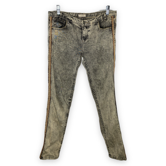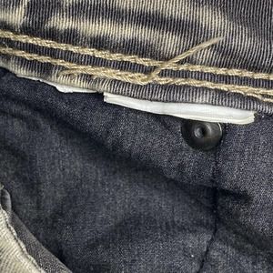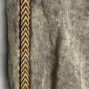 These vintage jeans are perfect for the grudge style. Match with a pair of high tops and you will be back in 1980's. The is a chevron pattern on the side of the jeans and there are some varies pulls in the material, see photo. There is also a pinhole in the back of pants.