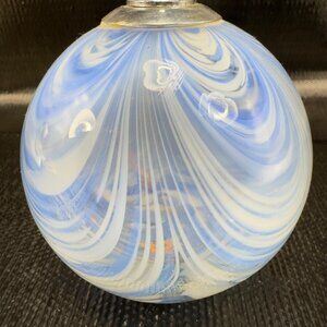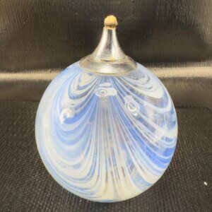 Vintage Pulled Feather Art Glass Oil Lamp Container Orb Blue White Dot Container