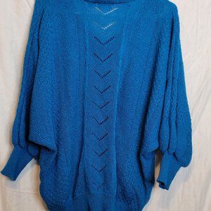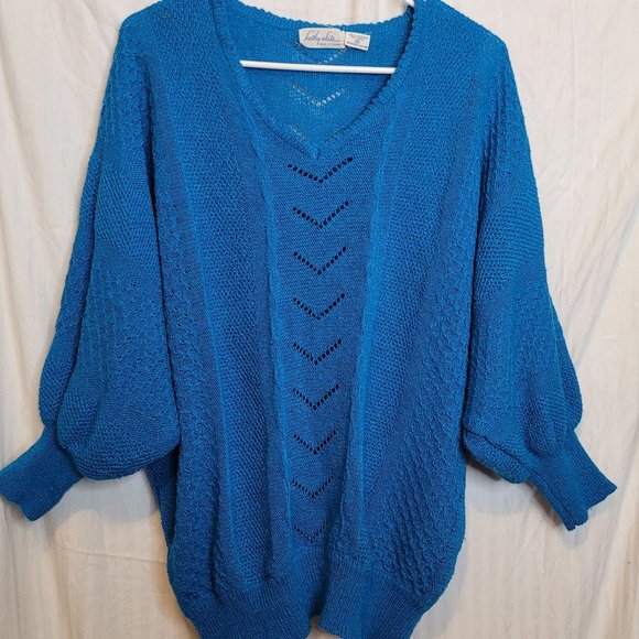 Vintage Pullover Sweater V Neck Batwing Oversize Acrylic Bright Blue Kathy White