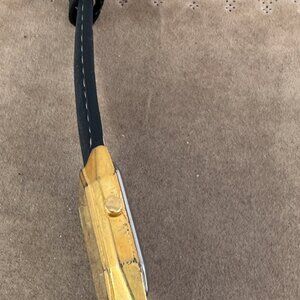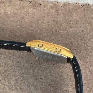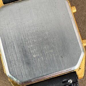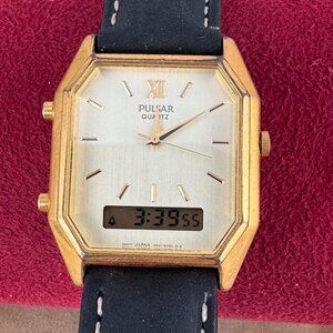 Vintage Pulsar Analog & Digital Alarm Wristwatch with dual time movement, champagne dial, raised markers, and Roman numerals. Model V041-5270 Mineral crystal with a few small scratches, gold-tone octagon case, and a -inch black faux leather strap. It is a casual, classic, and dress watch combined into one. Features a 12-hour format and water resistance. Case size: 1.375 inches (lug to lug) 1.125 inches wide. Material: metal case and stainless steel back, reg 541239.