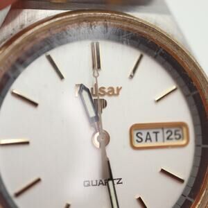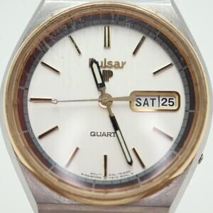 Vintage Pulsar Mens Watch 35mm Gold Tone White Day Date Y513-6059 w New Battery