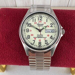 Vintage Pulsar Railroad Approved Quartz Watch in working and very good cosmetic condition. Marked on reverse VX43-0AD0 370379 Screw in Crown, Stainless Steel Water resistant to 10BAR (330 Feet). New Speidel Expandable 2 tone Stainless Steel Link Bracelet up to 7.75 inch in length. Case size measures 1.5 Inches in Diameter Sweeping Red Second Hand, Luminous Dial and Hands Hands Black 12 Hour markers and Red 24 Hour numbers Mineral Crystal is perfect and brand New Battery...This Watch is in really Like New and almost perfect shape with day and date at 3