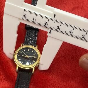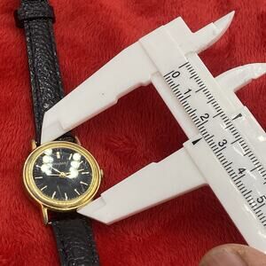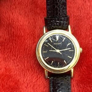 Visible scratches on watch face. The Vintage Pulsar Watch for women features a classic round design with a gold tone bezel and a solid gold dial with baton indexes. The watch has a 24mm leather band in black, a snap caseback, and a water-resistant quartz movement. With a case thickness of 7mm and a 12-hour dial, this dress/formal or casual timepiece is a stylish and functional addition to any collection. Made in Japan, this vintage watch is a testament to classic design and quality craftsmanship.