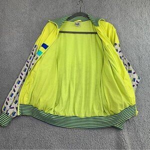 Vintage Puma Europe (Germany) zip front nylon shell jacket, size 3 (US equivalent is approx a Men's small). Fully lined. Neon yellow, green, purple, blue, black print on grey. Elasticated striped jersey collar, cuffs and bottom hem. A total 1980’s vibe! All gender.