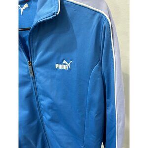 • Tags: Puma track jacket, womens athletic wear, full zip jacket, blue and purple jacket, casual jacket, workout jacket, sportswear, size L, polyester, elasticated cuffs, stylish jacket, two pockets, lightweight jacket