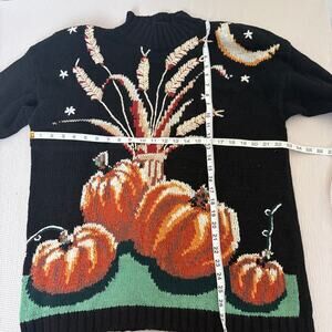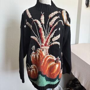 Stunning vintage Halloween harvest sweater in black cotton knit, size L (oversized fit). Features elaborate embroidered pumpkins, corn stalks, crescent moon, and scattered stars in bold autumn tones. High mock neck style with ribbed cuffs and hem, cozy midweight cotton knit construction. A rare statement piece perfect for spooky season, fall festivals, or styled as whimsical Whimsigoth cottage autumn fashion. Museum-worthy embroidered detail makes this one of the best seasonal sweaters to surface. Excellent condition.