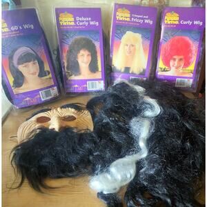 From a smoke free home, This sale will be for everything in the pictures, 4 wigs still in the package, never used but the packages show wear and age. The curly red / pink one is actually purple and does not match the picture but I have added what it looks like, also one older man rubber mask that is not marked and one wig black with white that has no packing and is marked Ben Cooper, that one is a bit messy and could be combed, the others are perfect.