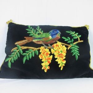 Gorgeous VTG 1950's 1960's throw pillow. Glorious wool yarn embroidered with punch needle on deep black velvet. Bird perched among what looks like wisteria blossoms.
