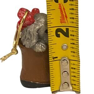 Really adorable Christmas ornament featuring a gray puppy dog hiding inside a shoe.