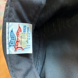 Vintage Purdue newsboy style flat cap and vintage decal. Black with yellow cursive on front. Snap back style. College Traditions brand.
