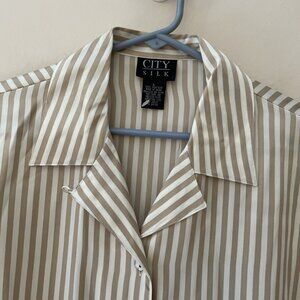 Vintage Pure Silk Button Down Shirt Women’s Large Beige Stripe Quiet Luxury