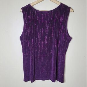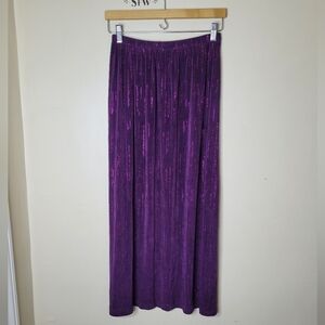 Shimmering late-80s/early-90s Caribou New York two-piece evening set in a rich purple. Substantial slinky stretch knit with vertical seed-bead shine. Sleeveless draped tank (side slits) + midi pull-on skirt with elastic waist—comfortable, fluid, and glam. Made in the USA. Perfect for holiday parties, cocktail, gala guest, or styled separately (tank with jeans, skirt with a satin blouse).