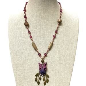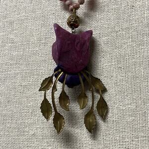 Vintage Purple Cat Pendant Brass Leaf Beaded Necklace