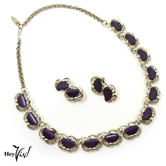 Vintage Purple Crescent Thermoplastic Necklace & Clip On Earring Set - Hey Viv