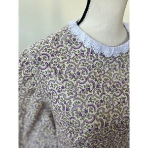 Excellent condition, homemade, no tags. Ditsy floral print in purple, 3/4 sleeves, maxi length. White eyelet scallop lace trim on crewneck and sleeves. Drop waist, lightly pleated tiered skirt. Back zipper. Truly a stunning one of a kind piece!